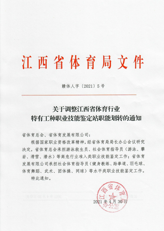 根據(jù)國(guó)家職業(yè)資格改革精神,國(guó)家體育總局職業(yè)技能指導(dǎo)中心于2021年1月份全國(guó)各省職業(yè)技能鑒定站發(fā)出通知,2020年底前水平評(píng)價(jià)類(lèi)職業(yè)資格全部退出職業(yè)資格目錄清單。江西省體育局黨組高度重視省國(guó)家職業(yè)資格改革舉措,將體育行業(yè)水平類(lèi)職業(yè)技能認(rèn)定工作職能劃撥給江西省體育發(fā)展有限公司,今后省體發(fā)公司將更好的服務(wù)全省體育行業(yè)從業(yè)者。